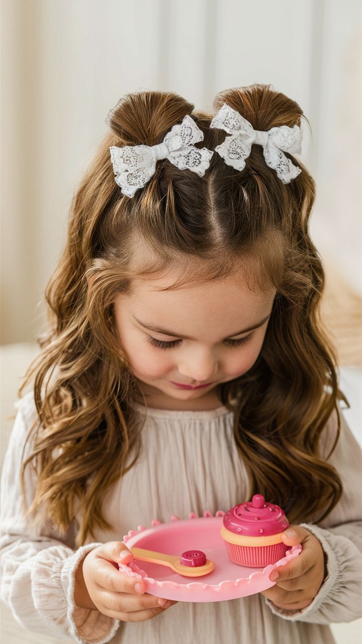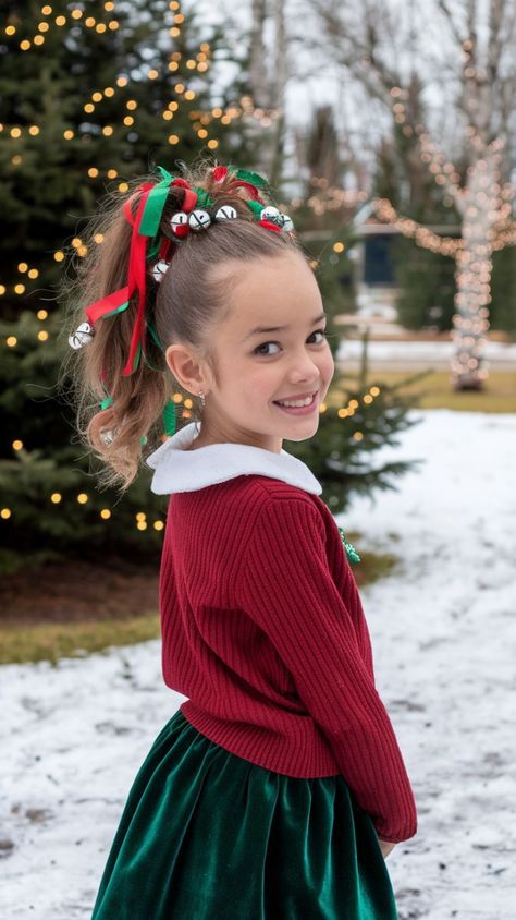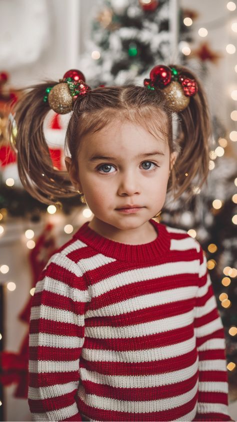 Soft, angelic, and cute beyond words — this hairstyle is perfect for toddlers or picture day. Two small buns perched neatly at the crown are tied with lace bows, creating a look that feels both vintage and timeless. It’s an easy option for mornings before school or festive dinners, and it works best for curly hair or soft natural waves. The gentle texture of the hair complements rounder face shapes beautifully and adds a touch of charm to holiday portraits.