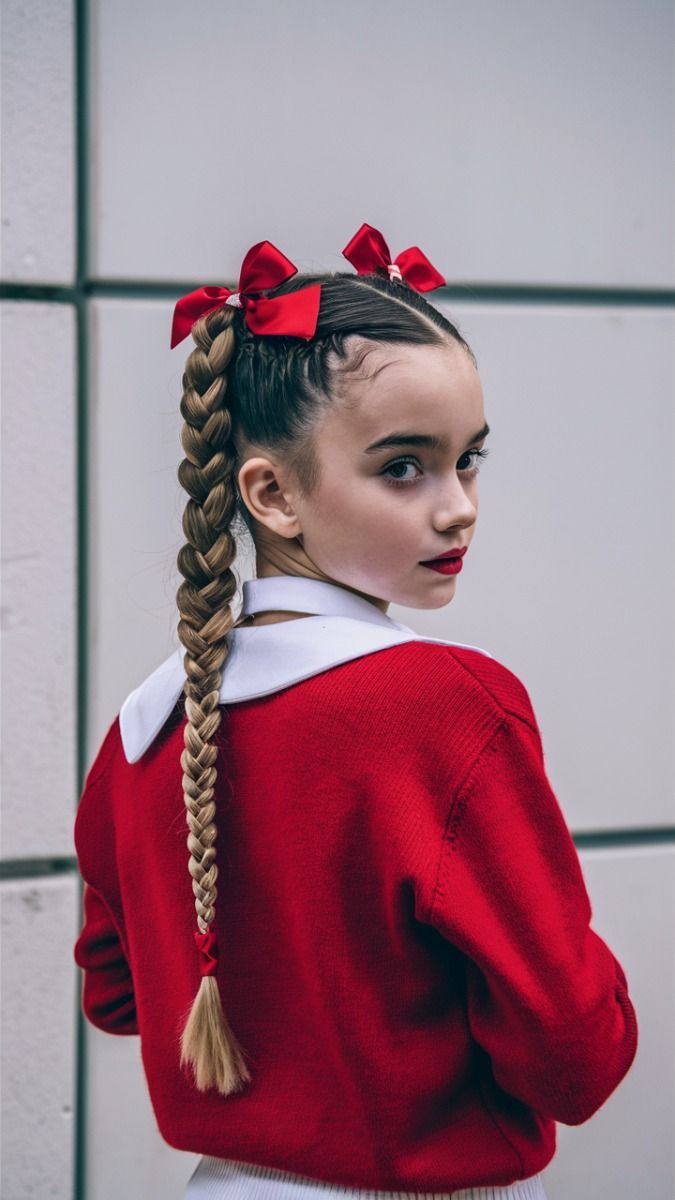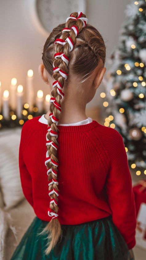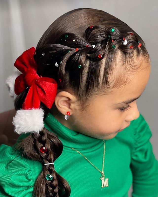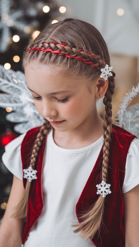 This style whispers innocence with a festive twist. A classic braided crown weaved with red satin ribbon feels traditional yet fun for little girls. It suits medium or long hair textures and makes a stunning choice for school, Christmas plays, or family gatherings. It’s also practical — stays secure through hours of excitement!