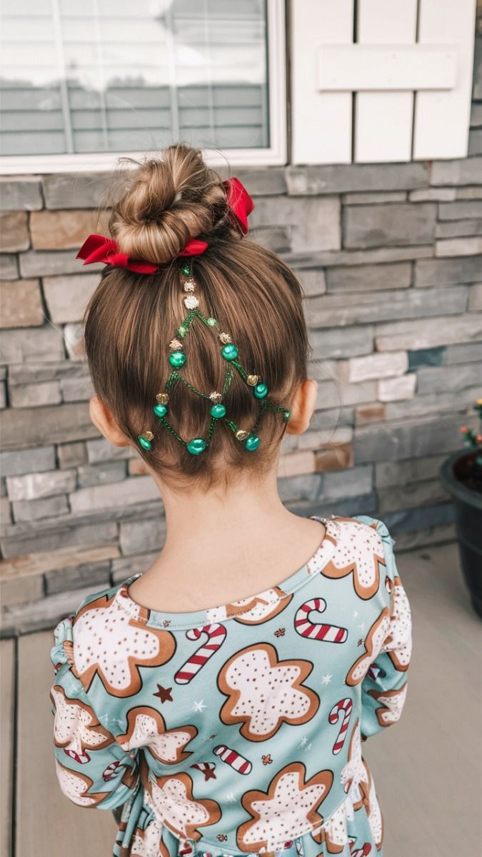 This one’s pure creativity — hair arranged into a Christmas tree pattern, complete with green string and mini ornaments! The small bun on top gives structure, while the crisscrossed beads below form a perfect triangular silhouette. It’s festive, playful, and totally easy to recognize from afar — ideal for toddlers and school parties.