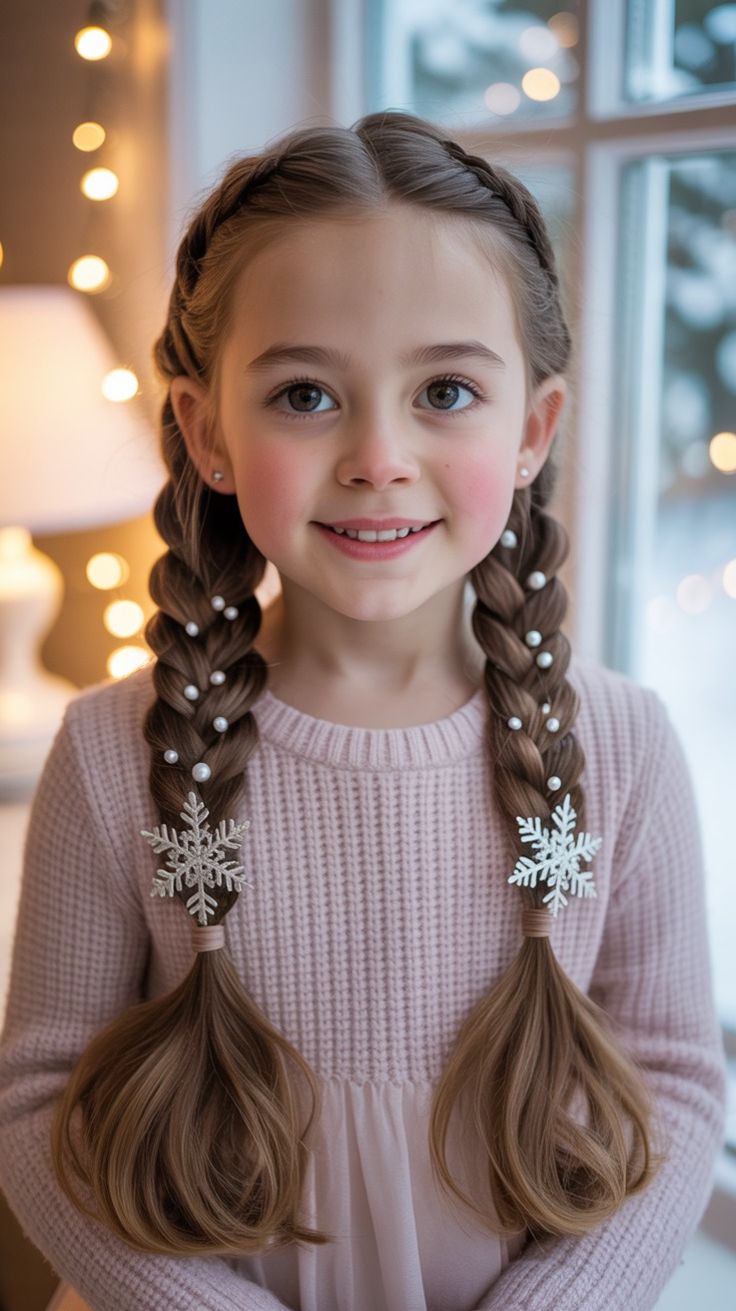 A winter fairytale in motion — twin braids threaded with pearls and finished with sparkling snowflake clips. This hairstyle suits almost any child’s natural texture, especially those with soft waves or straight strands. The blush-pink sweater adds to the delicate, snowy aura — it’s that “first snow” kind of look.