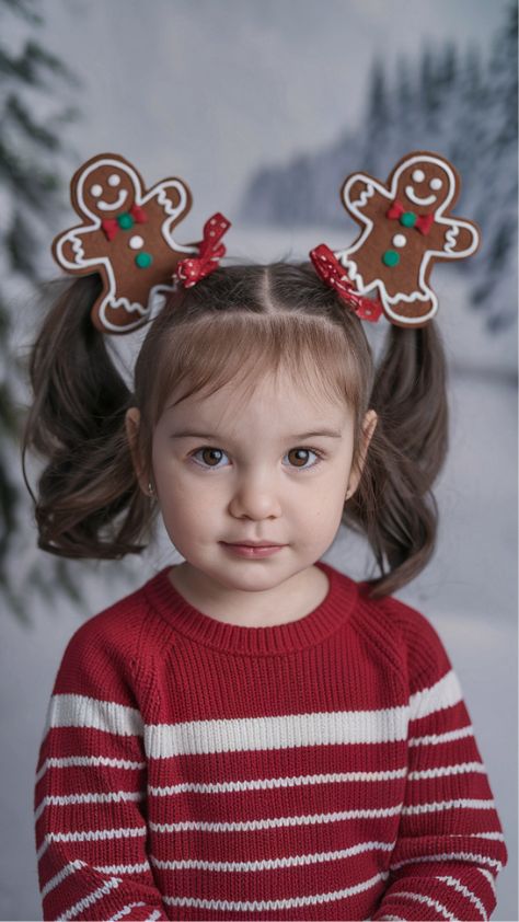 Equal parts cute and cheeky — twin pigtails with gingerbread hair clips bring childhood joy to life. This look is perfect for a school celebration or a birthday party during the holiday season. The red-and-white striped sweater ties in the candy-cane theme effortlessly, keeping things simple yet photo-ready.