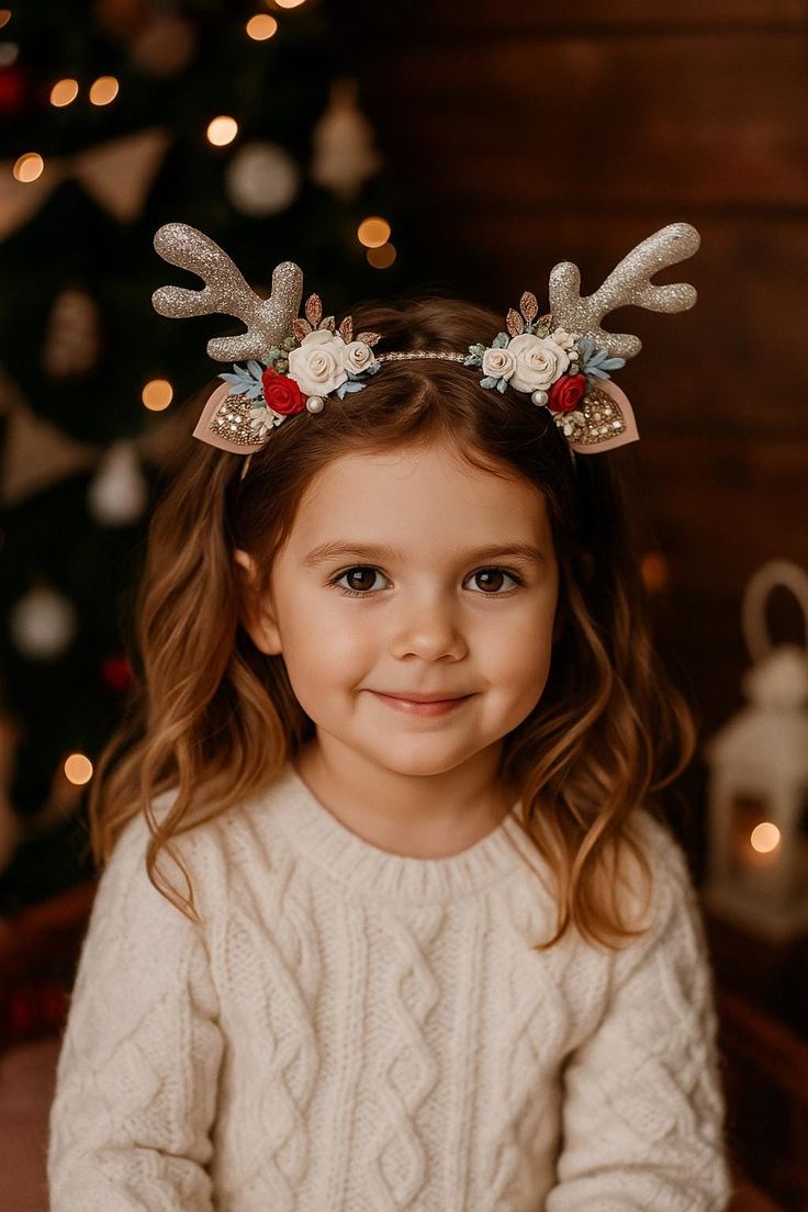 Soft waves meet a touch of whimsy — floral reindeer antlers transform a basic hairstyle into something storybook-worthy. The look blends natural texture with soft curls, creating a perfect match for cozy cream knits and golden holiday lights.