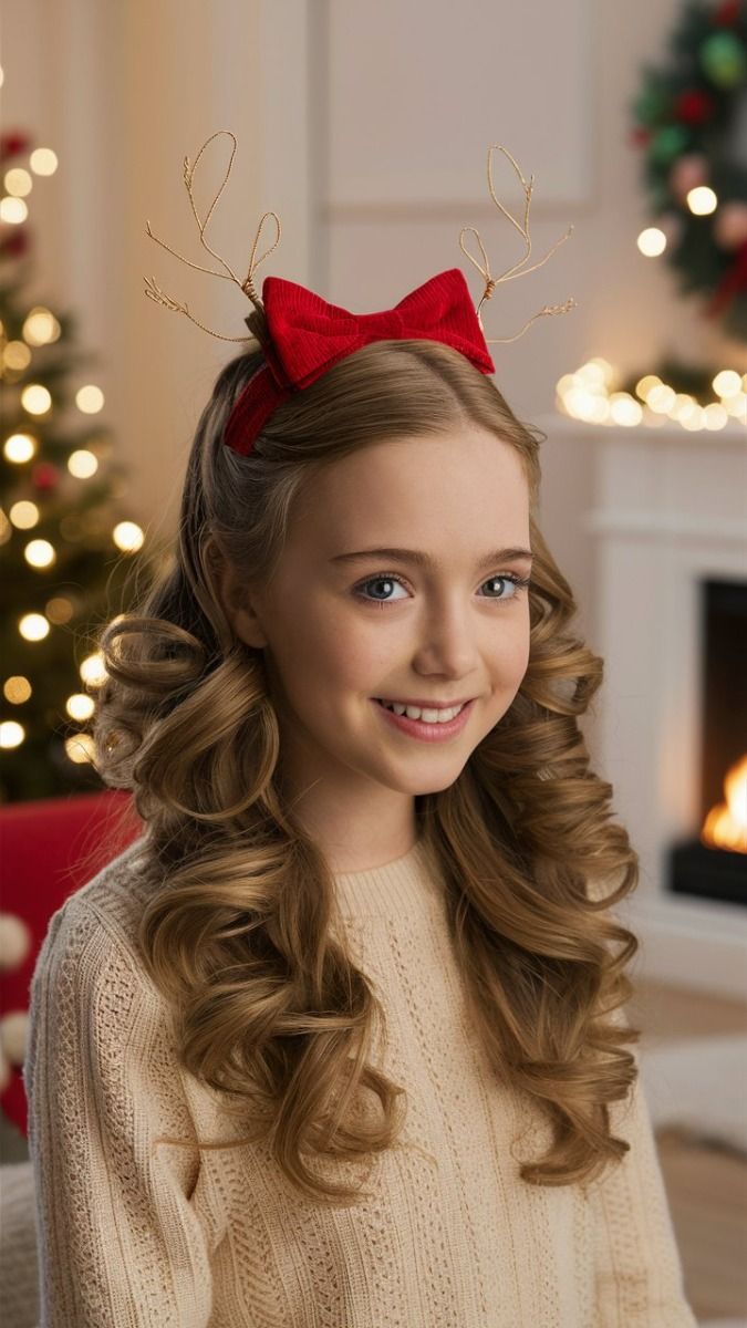 When elegance meets play, you get this — softly curled locks flowing beneath a red bow and delicate golden antlers. It’s polished yet youthful, ideal for picture day, to school events, or even a cozy birthday celebration.