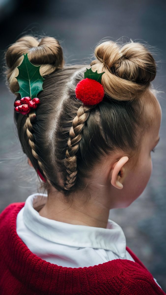 Two perfect mini buns adorned with holly leaves and a bright red pompom — festive perfection. Braids at the base keep it secure while adding texture. It’s a quick, simple, yet detailed look for a child who loves dressing up for school or Christmas Eve.