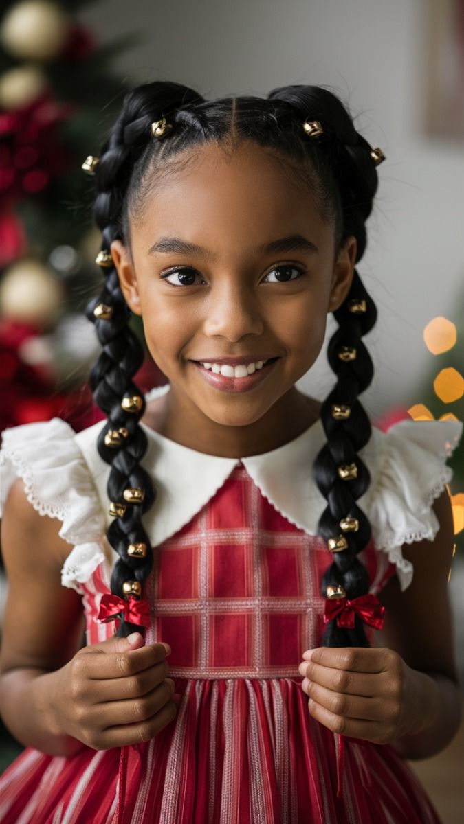 Talk about joyful noise — this hairstyle features two thick black braids decorated with gold bells and tiny red ribbons. It’s a perfect blend of black natural hair texture and festive accessories, giving every movement a subtle jingle. Ideal for school, to school, or even Halloween turned holiday event.