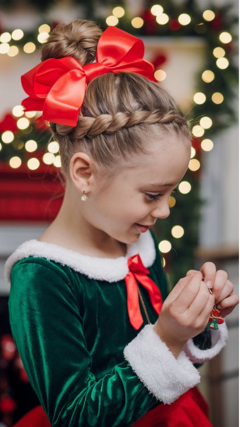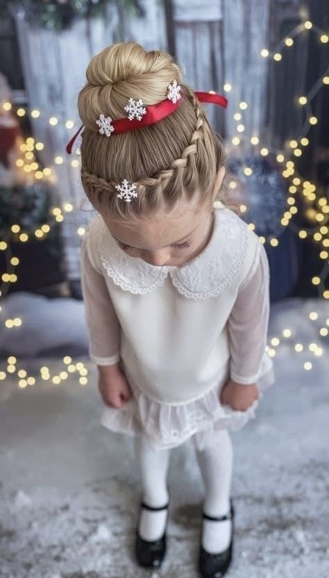 Graceful and timeless, this easy updo captures the spirit of elegance with a hint of Christmas sparkle. The braided crown wraps into a smooth bun, finished with a bold red bow that practically glows against blonde hair. Ideal for school recitals, birthday parties, or even a Halloween costume reimagined as Mrs. Claus — it’s neat, refined, and surprisingly quick to style.