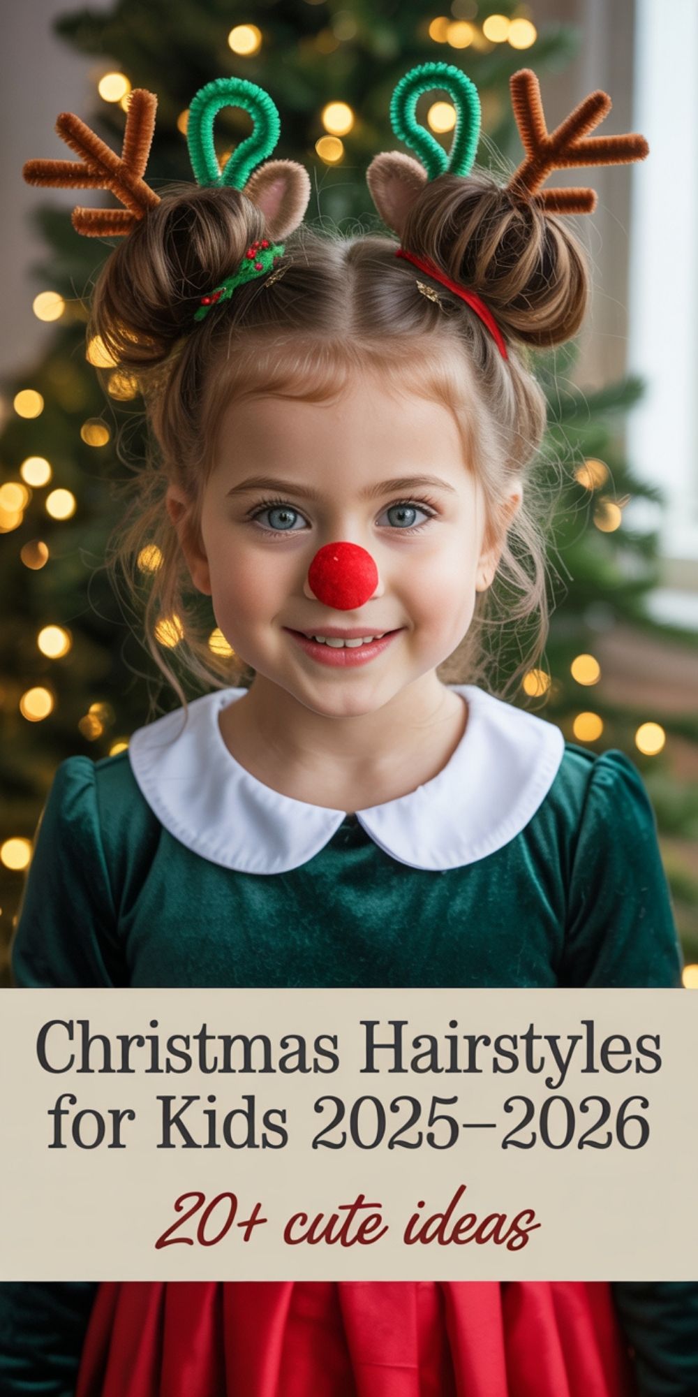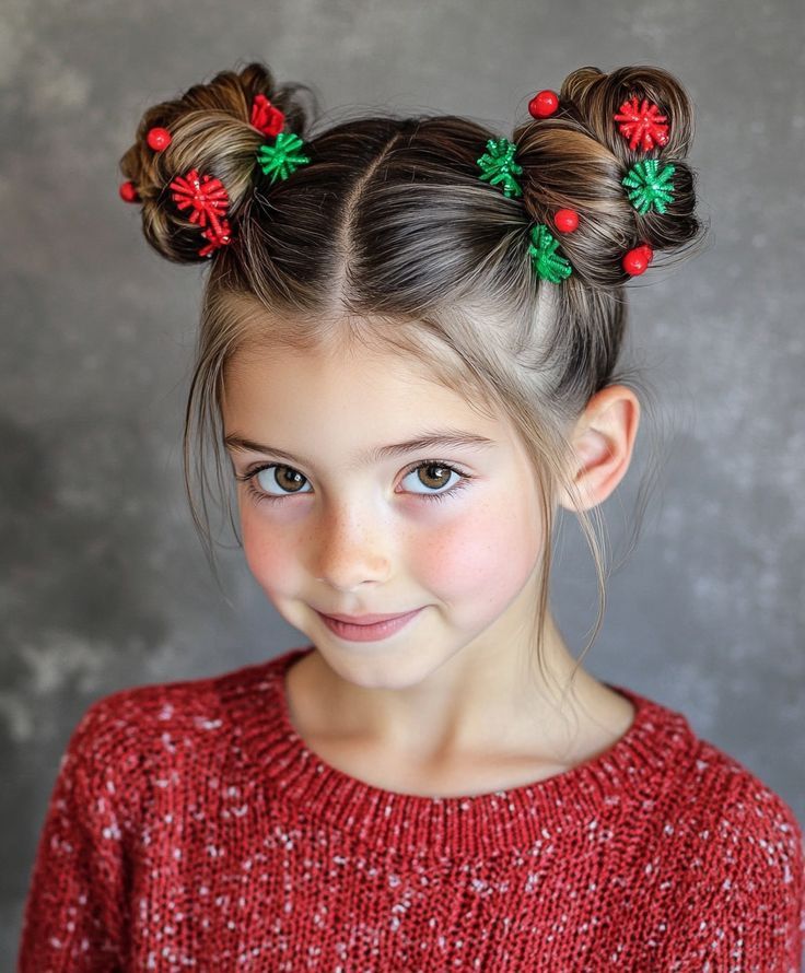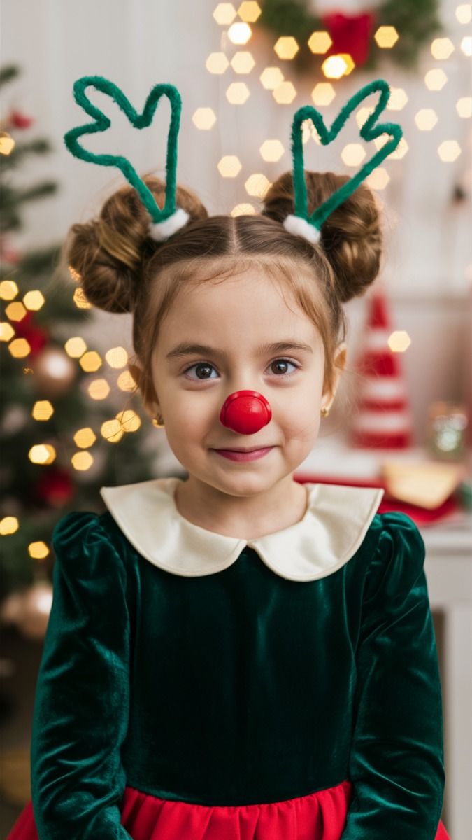 This one’s pure holiday joy — inspired by Grinch-era creativity and Christmas cheer. Space buns styled as reindeer antlers instantly turn any child into the life of the party. The look works beautifully for short hair or long hair, making it a simple yet cute favorite among parents.