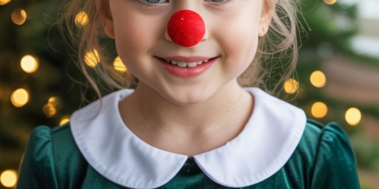 To elevate the outfit, add tiny golden earrings or festive barrettes. Avoid over-layering — the antlers and red nose already do all the storytelling you need.