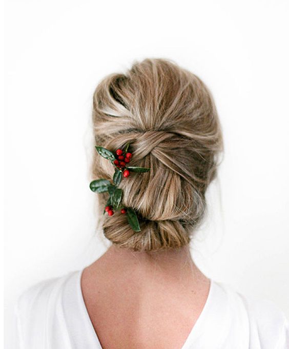 This simple yet stunning updo is adorned with natural sprigs of greenery, making it the ultimate rustic-chic holiday look. Ideal for a Christmas gathering in a cozy cabin or outdoor setting, this hairstyle not only elevates your hair game but also ties in beautifully with the season’s natural elements. The soft, swept-back locks create a feminine, romantic feel while the greenery adds an organic, festive touch. This is an especially good look for those with oval-shaped faces, as the pulled-back hair helps to emphasize symmetrical features.