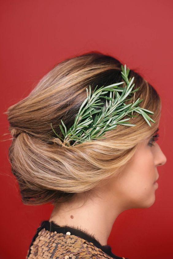 - Natural greenery: Fresh sprigs of rosemary or pine evoke a Christmas feel and are a unique alternative to traditional hair accessories.