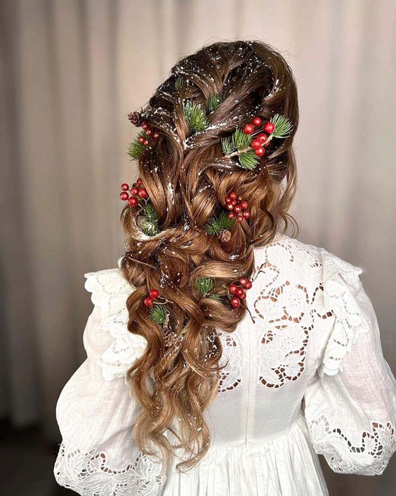 This stunning hairstyle screams Christmas fun! With curly locks adorned with festive holly accessories and tiny twinkling lights woven into the strands, it’s a standout look for holiday Eve celebrations or a fun photo shoot. It’s playful, bold, and undeniably festive.