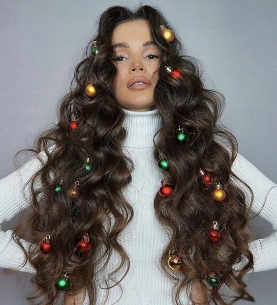 Nothing says holiday fun like decorating your hair with Christmas ornaments! This bold curly style takes inspiration from traditional holiday decor, with loose waves cascading down, adorned with small baubles that evoke the spirit of Christmas. It’s whimsical and playful, perfect for casual gatherings or Christmas parties with friends. The loose waves give the hair texture and movement, while the ornaments create a statement that is both festive and unique. This is a great look for those with long, thick hair, but anyone can try it with a few well-placed ornaments.
