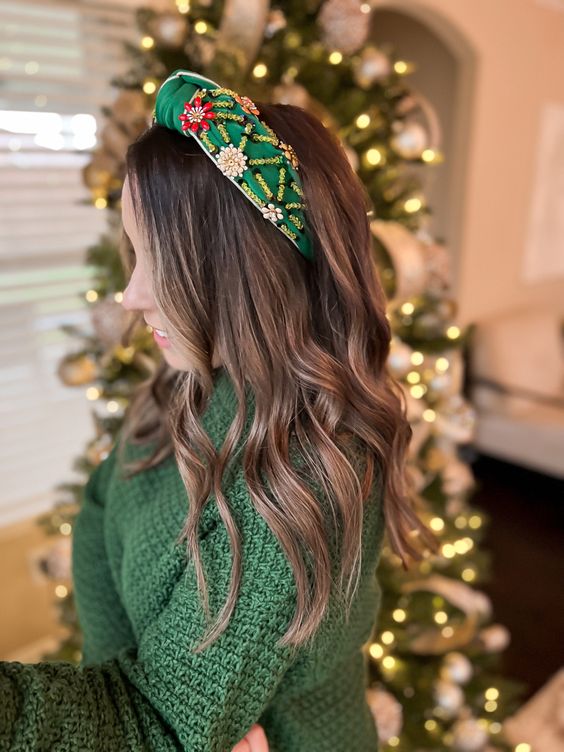 If you’re after a more playful yet easy style, this look combines long, wavy hair with a festive green headband. The headband, adorned with Christmas-themed embellishments, is a perfect accessory to make you feel festive without overdoing it. Paired with a cozy knit sweater, this look is casual yet chic for holiday celebrations.