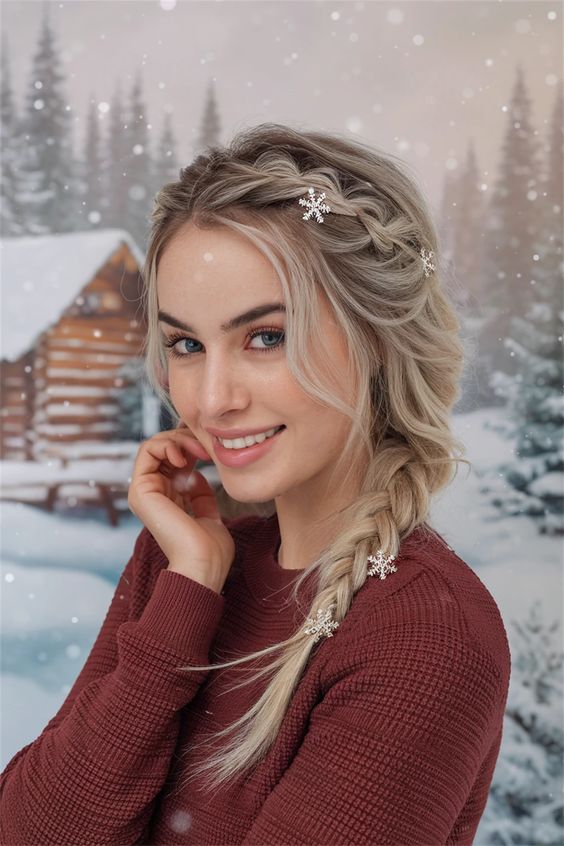 This whimsical, snowflake-adorned braid brings the magic of a winter wonderland to your hairstyle. The loose, boho-inspired braid is topped with delicate snowflake hairpins, making it an ideal choice for any holiday party or Christmas Eve dinner. The blonde tones paired with the soft, tousled braid exude a carefree yet polished look. It’s simple to achieve but doesn’t compromise on charm, making it perfect for those looking for an easy, elegant solution to long hair during the holidays.
