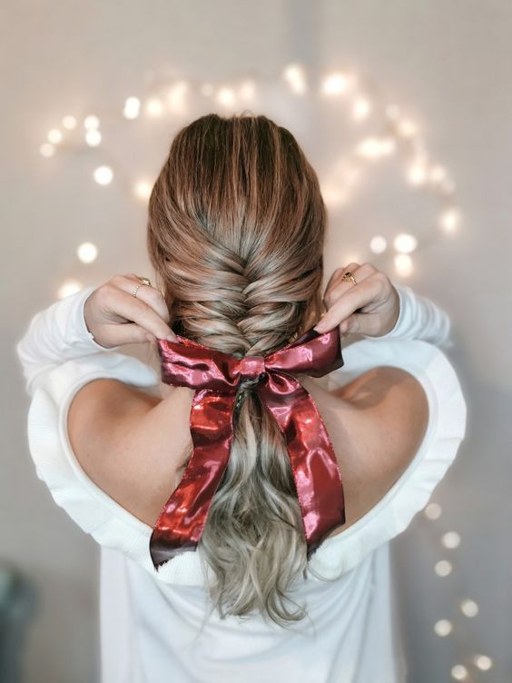 For a simple yet show-stopping Christmas hairstyle, the fishtail braid tied with a vibrant red ribbon is hard to beat. It blends a bit of traditional holiday color with modern style, making it ideal for both day and evening events. The fishtail braid is pulled to perfection, creating a thick, intricate weave that stands out against the rich texture of the ribbon. Whether you’re attending a Christmas Eve dinner or a festive work event, this hairstyle pairs perfectly with anything from a chic red dress to a cozy turtleneck sweater.