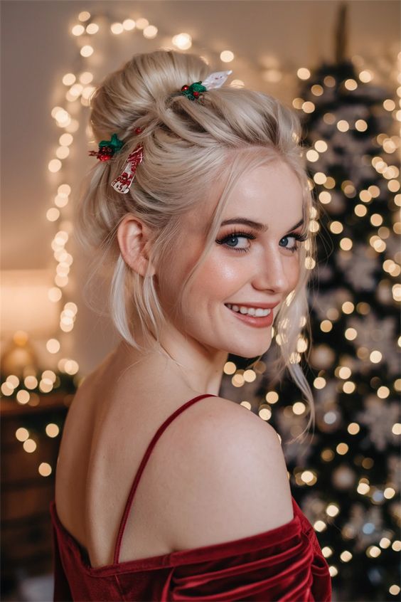 This hairstyle features a timeless updo adorned with delicate holiday-themed accessories, perfect for adding a festive touch without going overboard. The blonde hair is styled into a neat, voluminous bun, which gives the entire look a regal yet approachable feel. The bright red velvet dress adds a sophisticated, wintery contrast, making this an ideal look for more formal events.