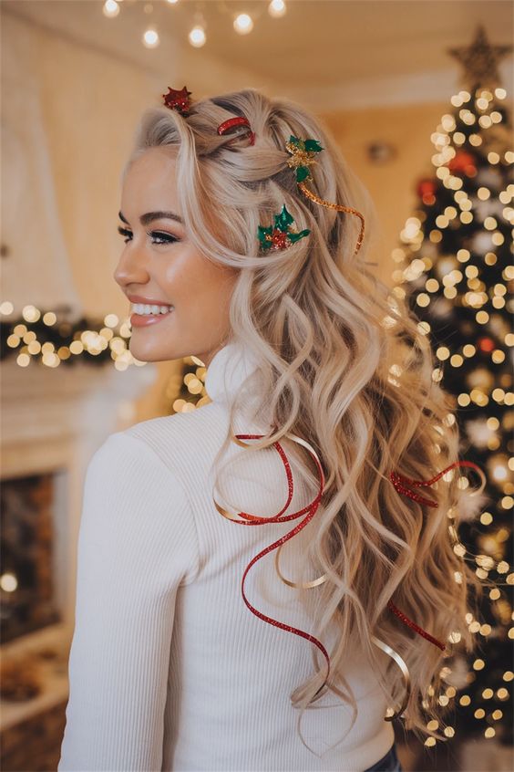 For a Christmas party hairstyle that’s fun and easy, this long easy curled glam look is festive and playful. The loose waves cascade down the back, paired with shimmering holiday ribbons that add an instant touch of cheer. This style works for a more laid-back gathering, such as a family Christmas party or a cozy office celebration. The addition of green and red accessories ties in the holiday spirit without overdoing it. It’s a great easy option for long or medium hair, providing both volume and bounce. This hairstyle suits most face shapes due to its soft framing, and it works well for figures that appreciate a bit of length to elongate their overall look.