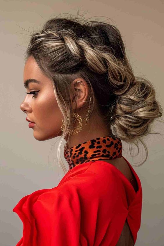 A sparkly hairpiece could elevate the bun further, but be mindful of not overdoing it. The braids should remain the central feature. Avoid pairing this with overly bold jewelry, as it may clash with the detailed hairstyle.