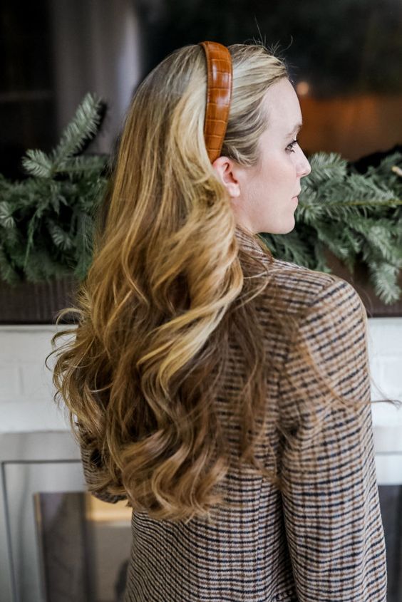 This classic half-updo, adorned with a wide, glossy headband, is a medium simple look that exudes both elegance and practicality, making it ideal for office Christmas parties or casual holiday gatherings. The loose waves add a soft, feminine touch, while the headband gives it a polished and structured appearance. The look is particularly well-suited for those with mid-length to long hair, as the length allows the waves to flow gracefully down the back. It’s a style that works well for any face shape and can easily transition from day to night events.