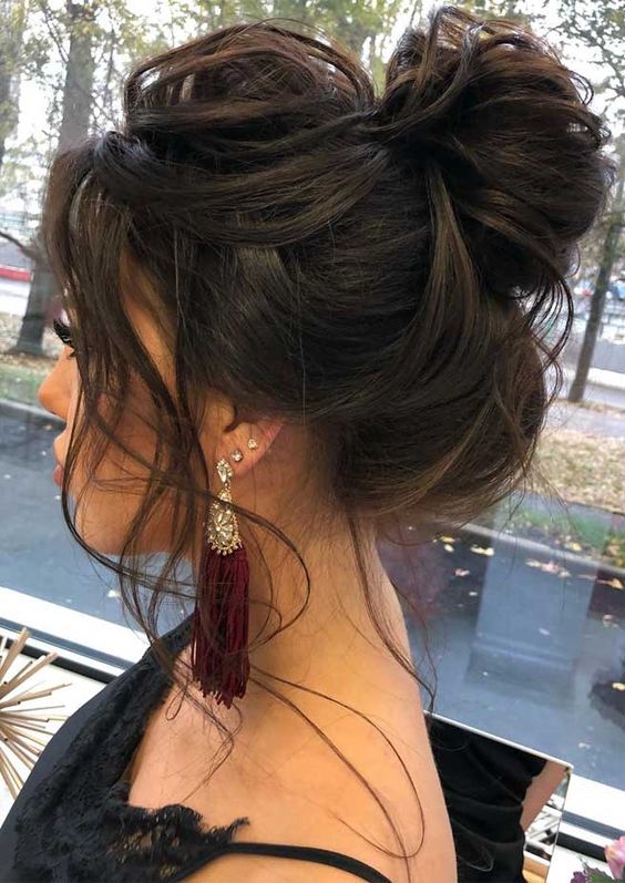 For a more relaxed and easy look, this messy high bun with loose strands is a perfect balance of effortless and chic. The loose tendrils framing the face soften the look, giving it a more laid-back vibe, perfect for casual Christmas events or even a cozy office holiday party. This style is ideal for those with medium to long hair, as it requires length to achieve the volume of the bun. The hairstyle is both practical and flattering, making it a go-to option for someone who wants to look polished without putting in too much effort. It works particularly well with oval or round face shapes, as the loose strands help elongate the face.