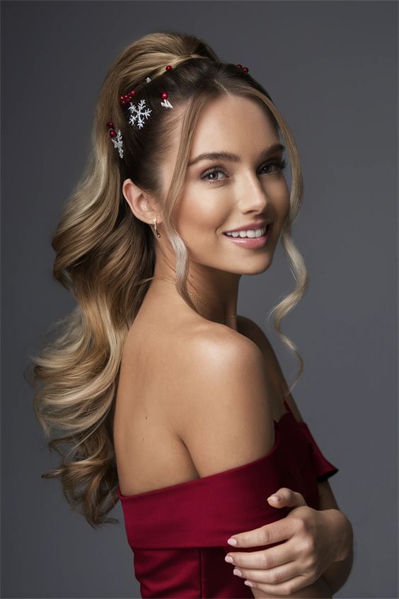 Here’s a medium simple hairstyle that merges elegance with a festive flair. The long ponytail cascades down in soft waves, while snowflake and berry pins add a playful, holiday-inspired touch. This is a perfect hairstyle for those who want a polished look without the commitment of an updo. The off-the-shoulder dress complements the feminine softness of the hairstyle.