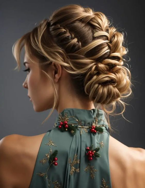 For those who want to bring the festive spirit directly into their hairstyle, this elegant twisted bun with holly accents is a stunning option. The intricate twists provide a sophisticated texture, while the subtle holly decorations bring a unique, holiday-specific element to the look. The green dress with red and gold embellishments perfectly ties in the Christmas theme, making this hairstyle a great choice for a festive event.