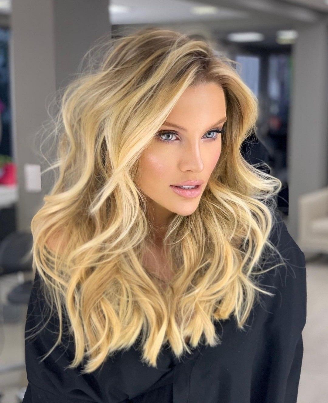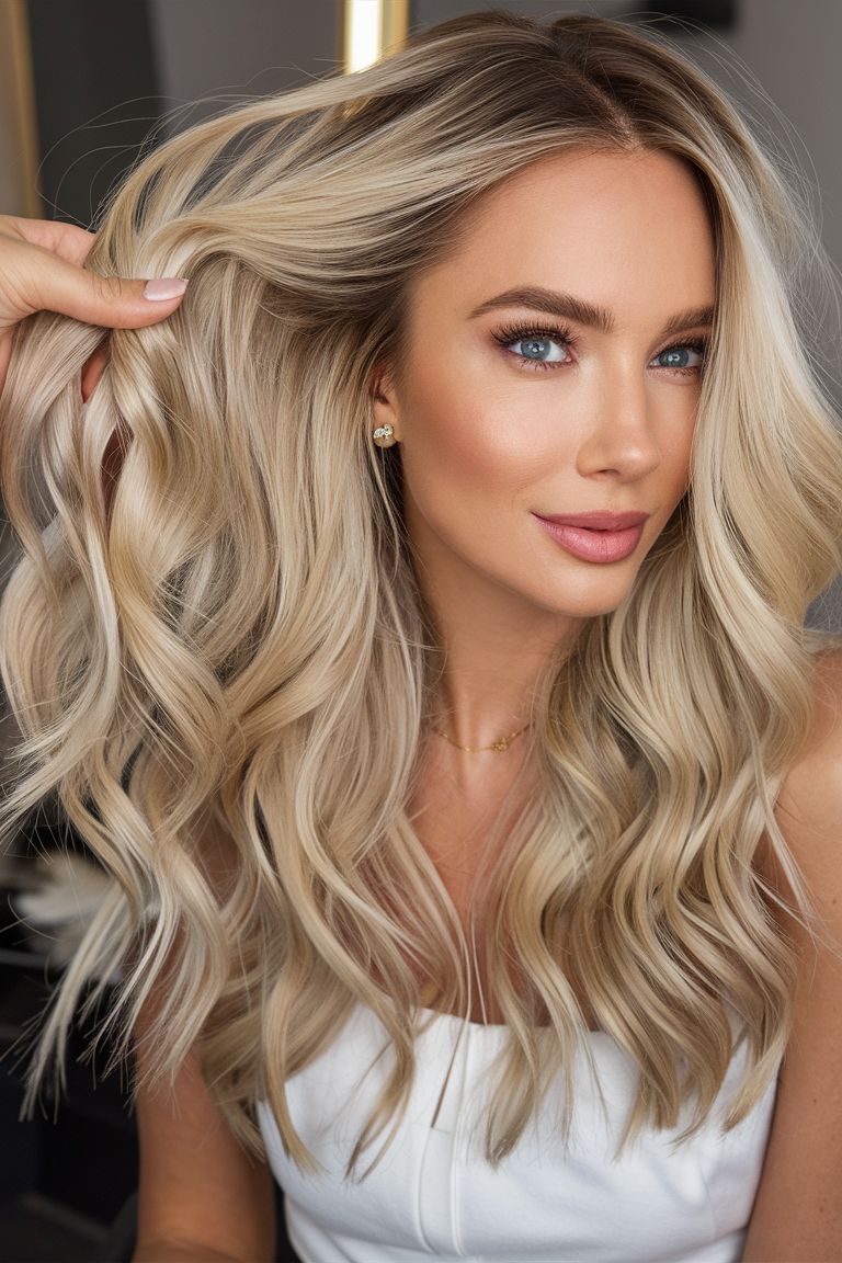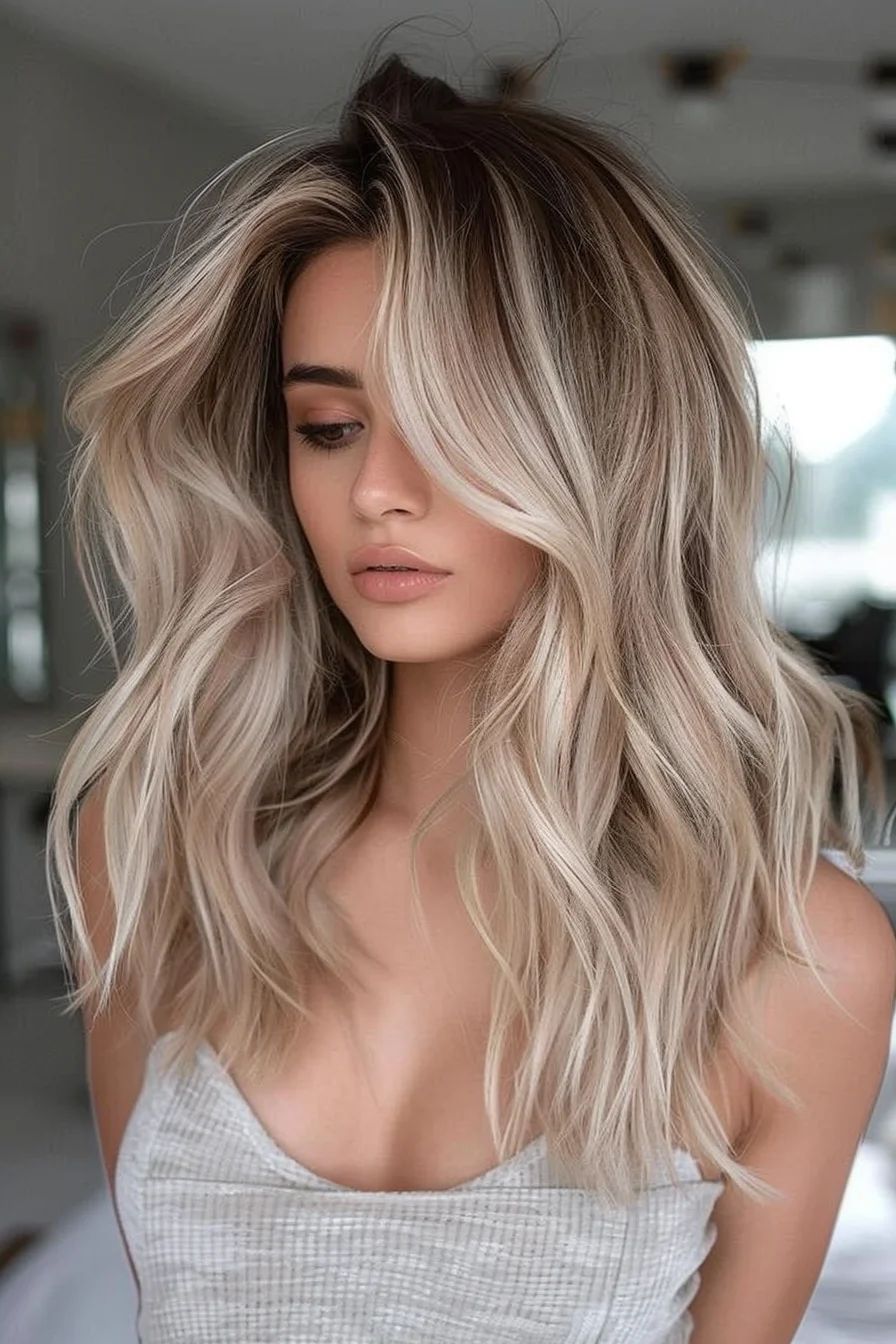 This rooted blonde blends dark roots into warm, sunlit ends for a high-contrast, low-maintenance look. The waves are relaxed yet deliberate, making it perfect for medium length to long hair. It’s a style that thrives in casual-to-chic environments — brunches, city strolls, or creative workplaces. On the downside, the strong root contrast might not flatter very short face shapes, as it can create a visual elongation.