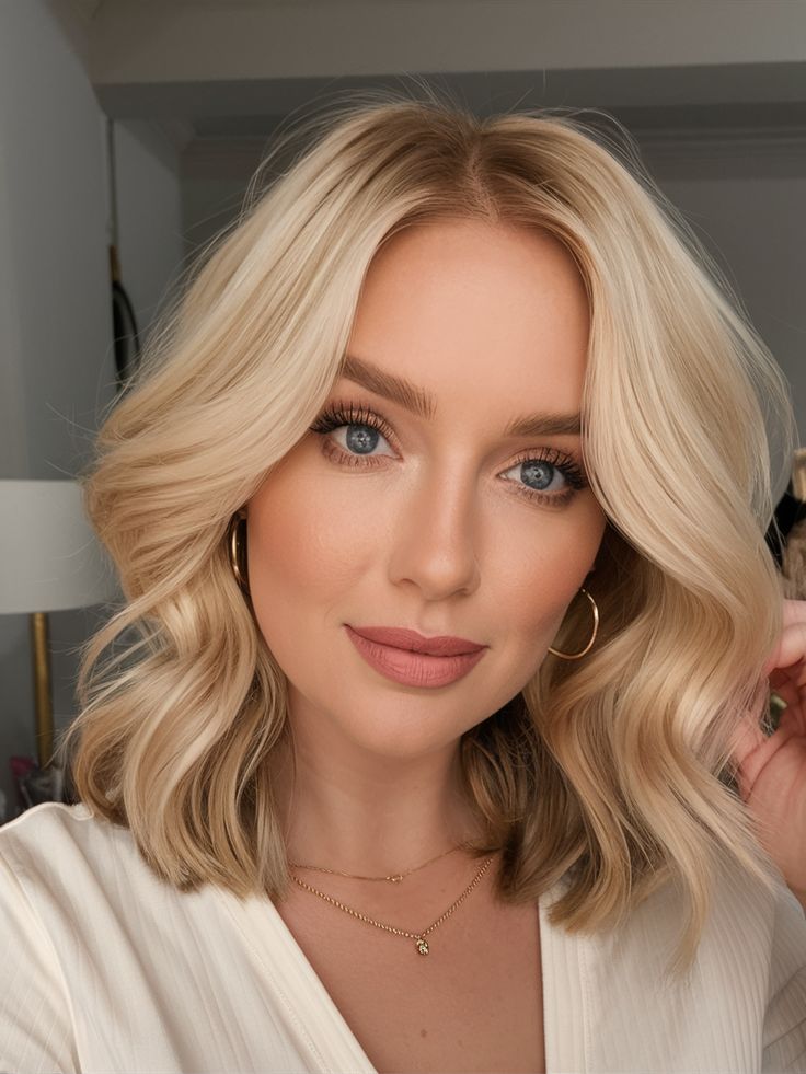 This chic, short cut brings a bold freshness to blonde hair. Sitting at shoulder length, it pairs well with a variety of outfits and settings — from work meetings to weekend getaways. The blonde tone is bright yet soft, and the face-framing layers work wonders for highlighting blue eyes.