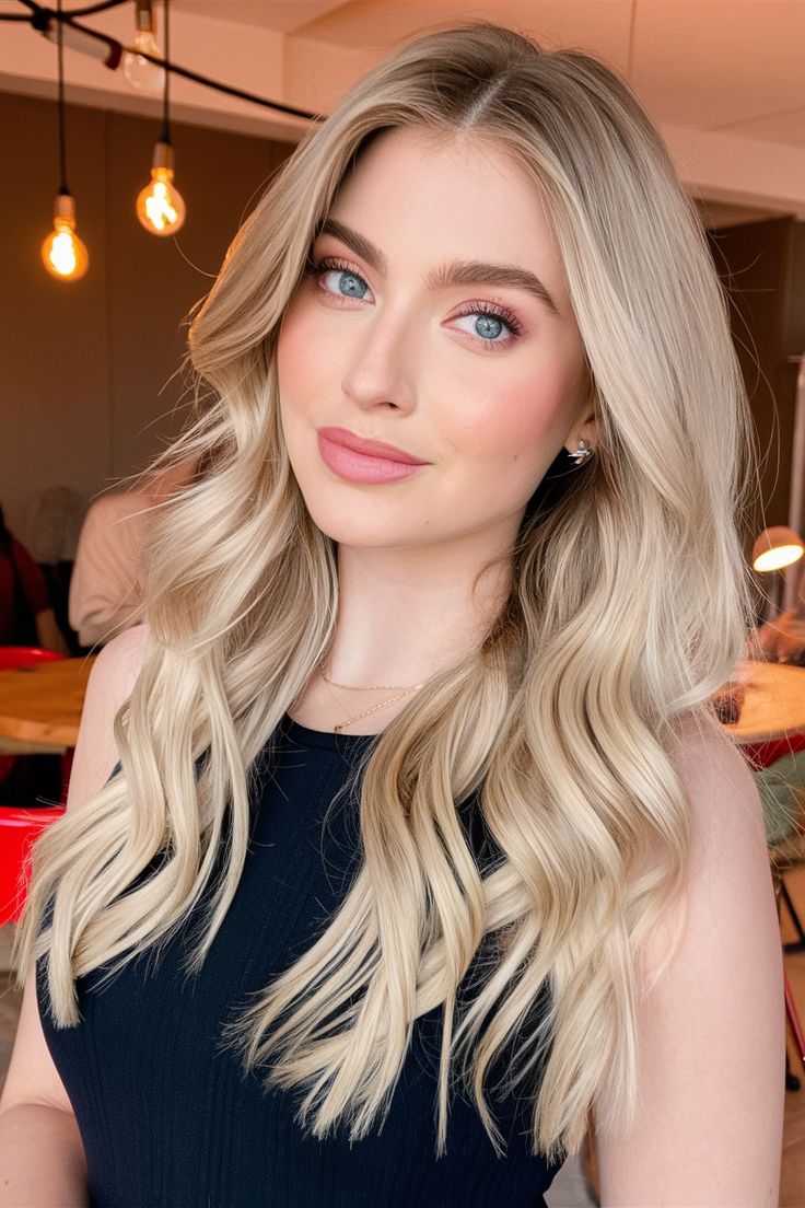 This style captures that creamy, refined blonde that feels both fresh and timeless. The soft vanilla tone flatters blue eyes beautifully, and the smooth wave pattern gives the illusion of fullness — perfect for medium length to long hair. It’s a look that thrives in professional settings, date nights, and even casual coffee meetups, but may wash out deeper skin tones unless paired with a warmer undertone.