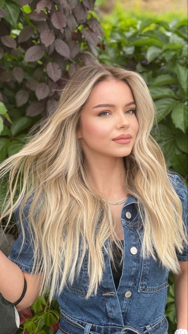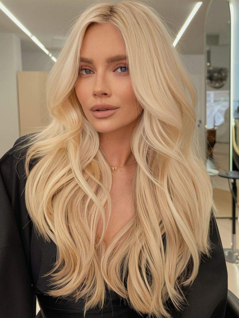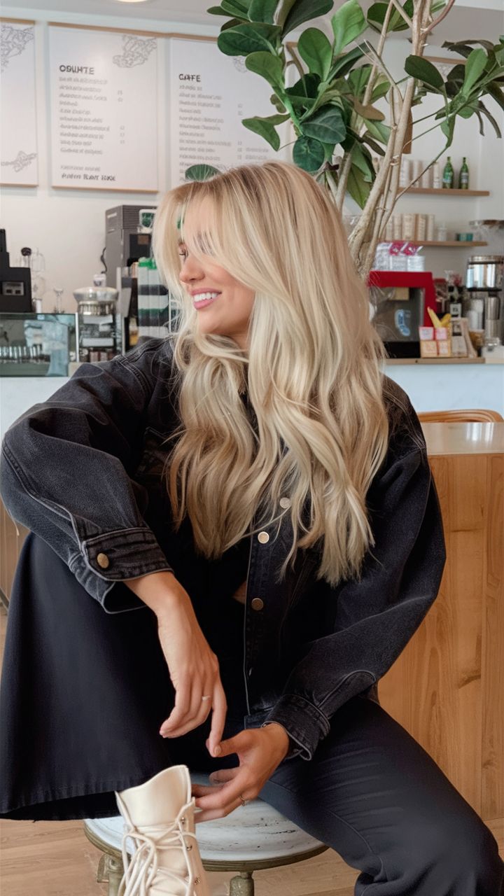 The soft waves cascade with a lived-in elegance, showcasing a bright yet natural blonde that works beautifully for long hair lovers. Subtle low lights peek through, adding texture without breaking the light, while a delicate money piece instantly lifts the complexion — especially flattering for those with blue eyes. This shade is versatile for day-to-night wear: perfect for office chic, brunches, and even evening events, though those in high-maintenance climates should be prepared for regular toning to keep the brightness crisp.