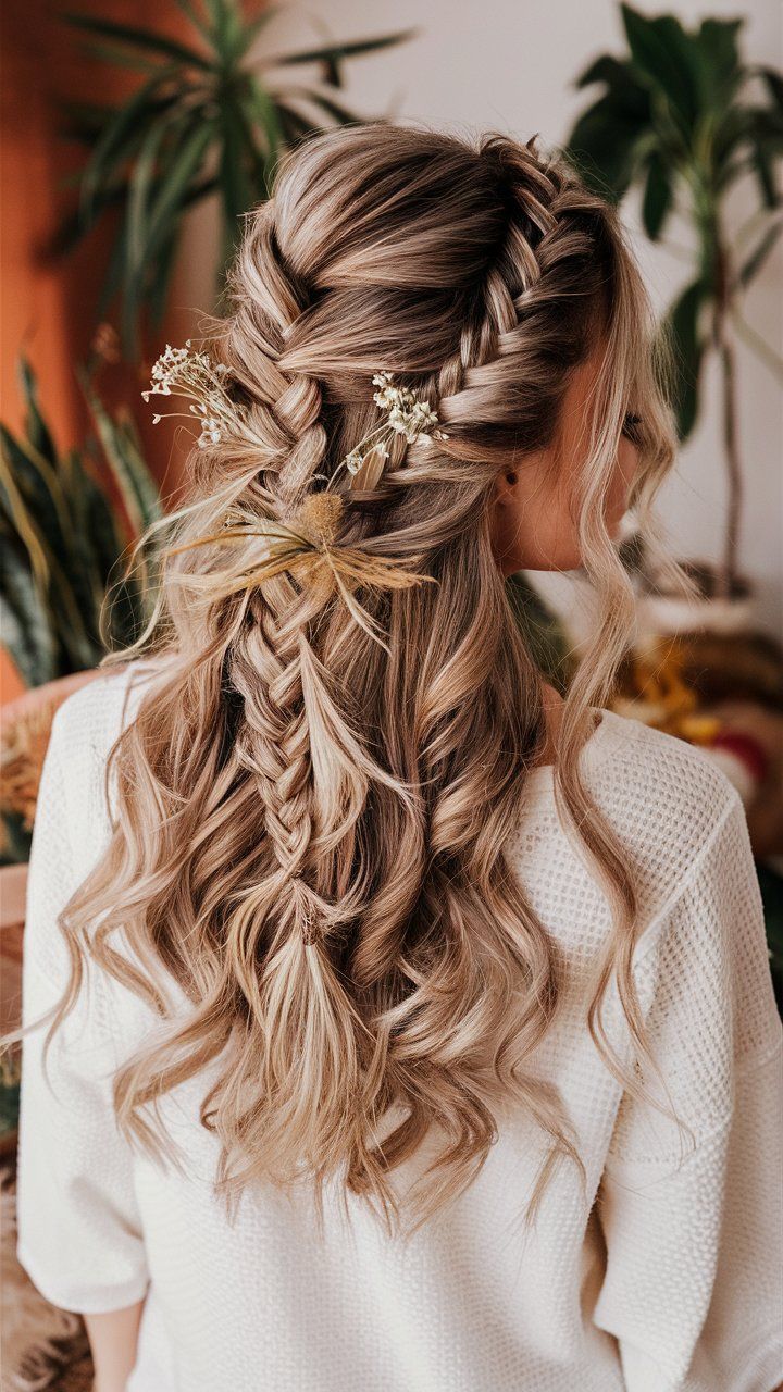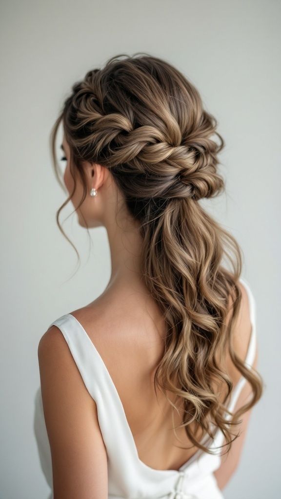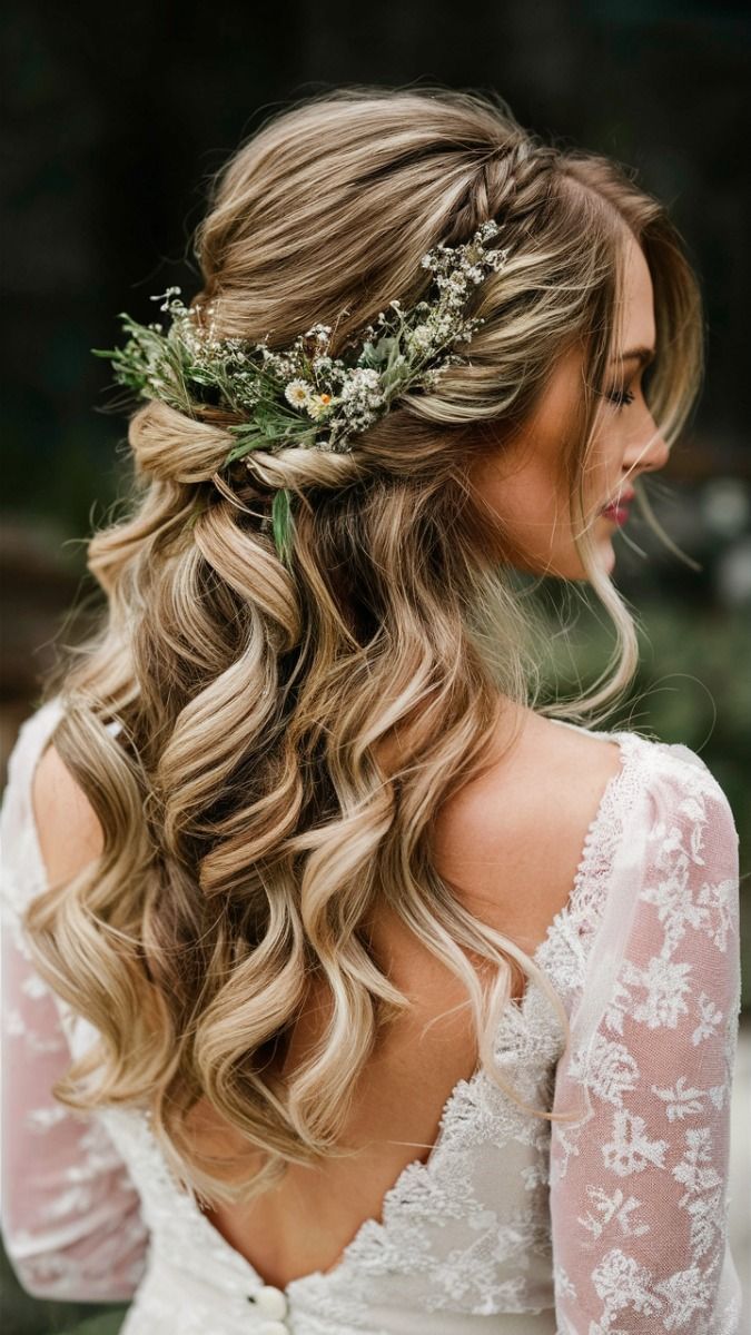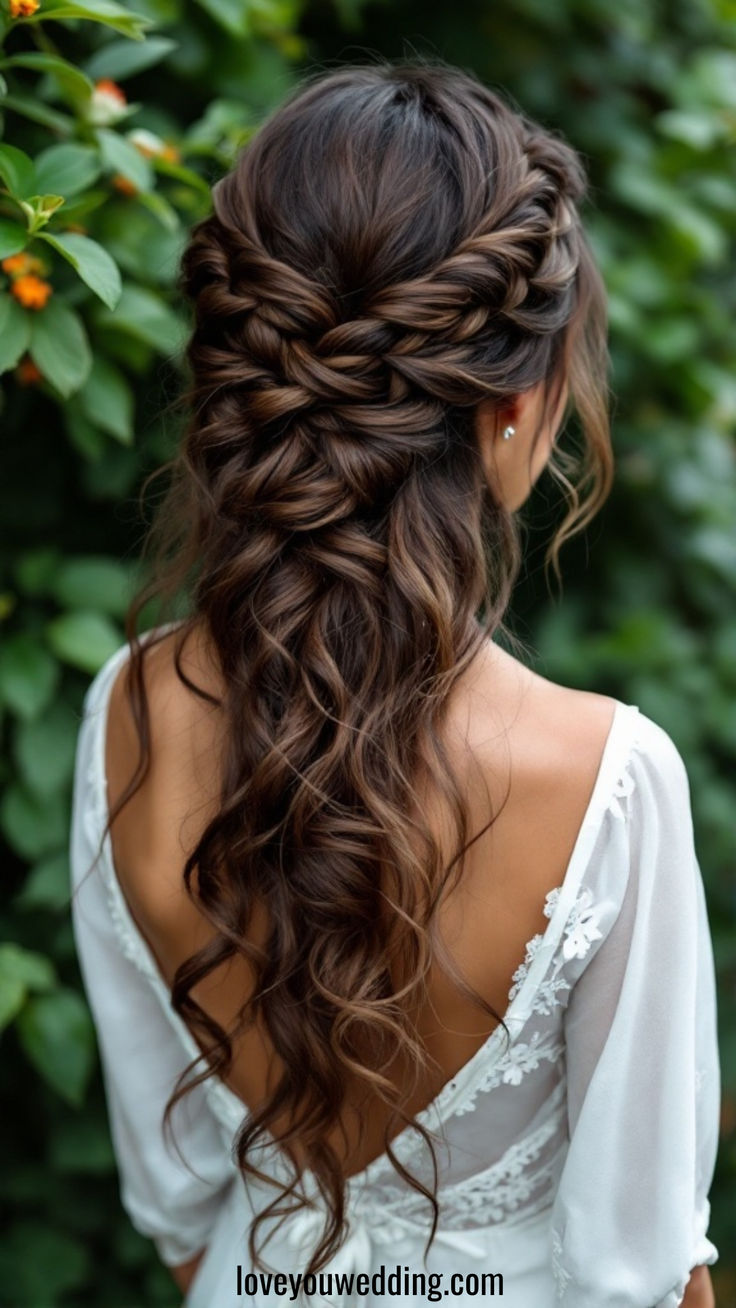 Welcome to the ultimate bridesmaid half hairstyle for Fall 2025. This stunning style blends tousled waves with intricate braiding that crisscrosses at the back in a loose, almost floral-like pattern. The long cascading curls make it an excellent pick for long hair bridesmaids or long hair guests aiming for romantic flair with minimal effort. This hairstyle is especially flattering for those with backless dresses or illusion lace.