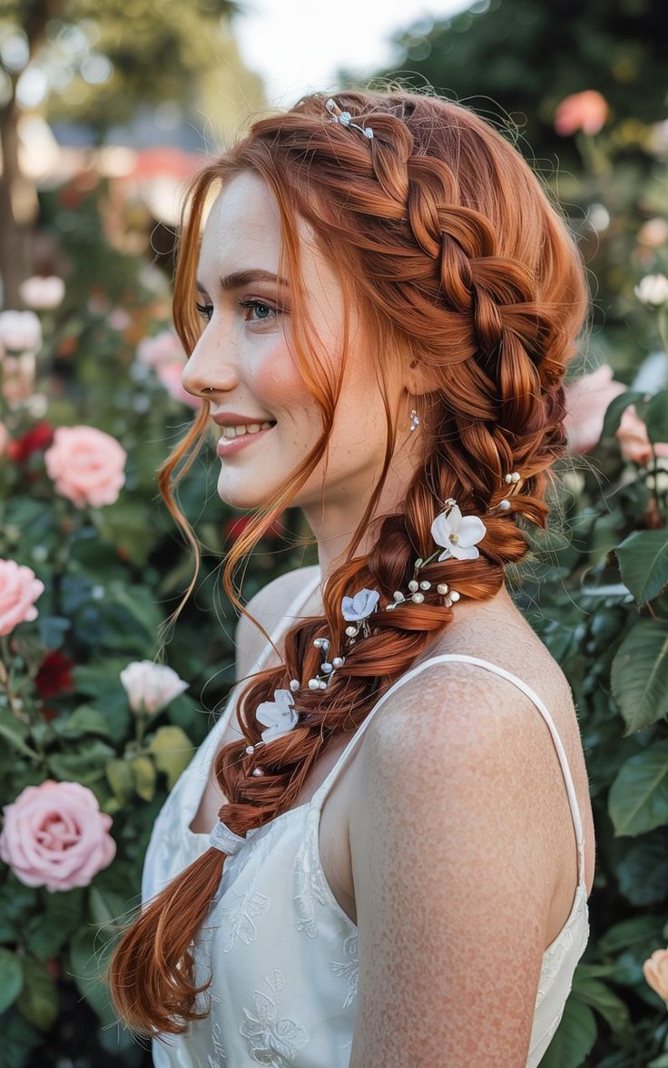 This romantic bride look is pure poetry in motion. Thick, sculptural braids twist and tumble into a cascading fishtail, scattered with delicate white blossoms and pearl accents. The fiery copper hue adds a storybook warmth, playing beautifully against a sleeveless embroidered gown. Loose strands softly frame the face, giving it a feminine, effortless charm that feels dreamy but grounded. Perfect for brides with heart or oval face shapes, this look balances elegance with softness — ideal for garden ceremonies or floral-filled vineyards.