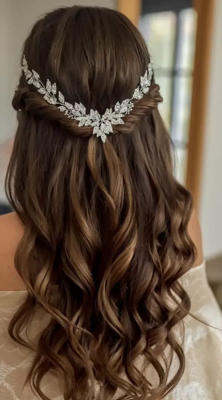 This style proves that minimal can still be majestic. With softly curled medium length tresses and a silver leaf hairpiece, it’s the kind of look that works beautifully for a bridesmaid, guest, or even a bridesmaid short hair scenario if extensions are used. The twist-back detail keeps it modern, while the crystal embellishment adds that magical bridal shimmer. Ideal for more formal weddings or classic indoor venues.