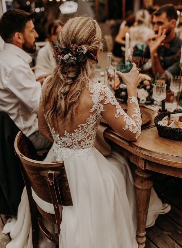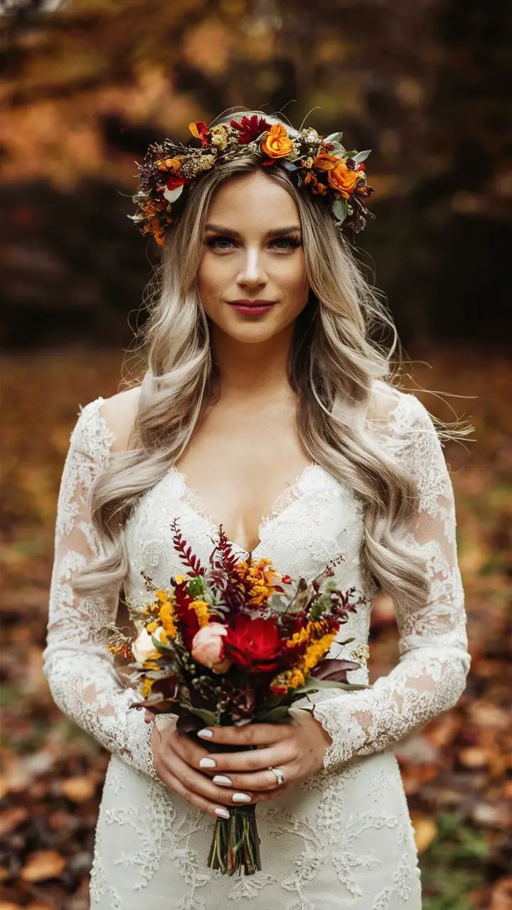 This bride went full floral fantasy — and we’re here for it. Thick tendrils of long hair fall freely down the back, kissed with soft waves and wrapped in cascading dried flowers in rich autumn hues. The gown’s lace sleeves and open back bring a breezy vintage energy to the entire ensemble. This look sings in boho forest weddings or barn venues with floral-heavy décor. It works best on brides with medium to thick hair texture who want to fully embrace the fall vibe.