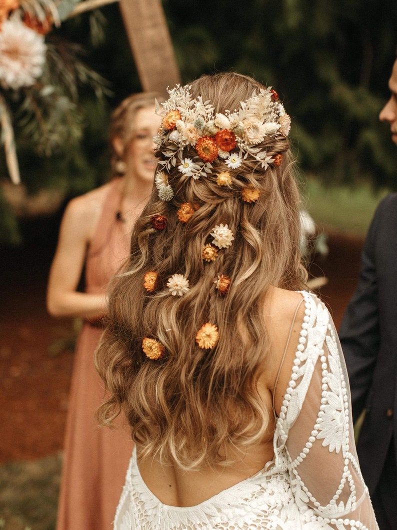 This hairstyle screams harvest romance. Loose waves cascade down the back, interwoven with burnt orange, ochre, and cream-toned dried flowers. It’s a carefree yet curated option perfect for a long hair bride looking to embody that rustic fall vibe. This works especially well for outdoor barn weddings, boho ceremonies, or even a vineyard venue. The natural texture adds softness while the scattered florals make a gentle statement.