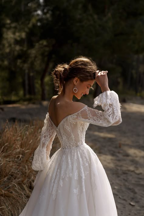 Off-shoulder lace gown: Enhances the softness of the hairstyle without crowding it.
