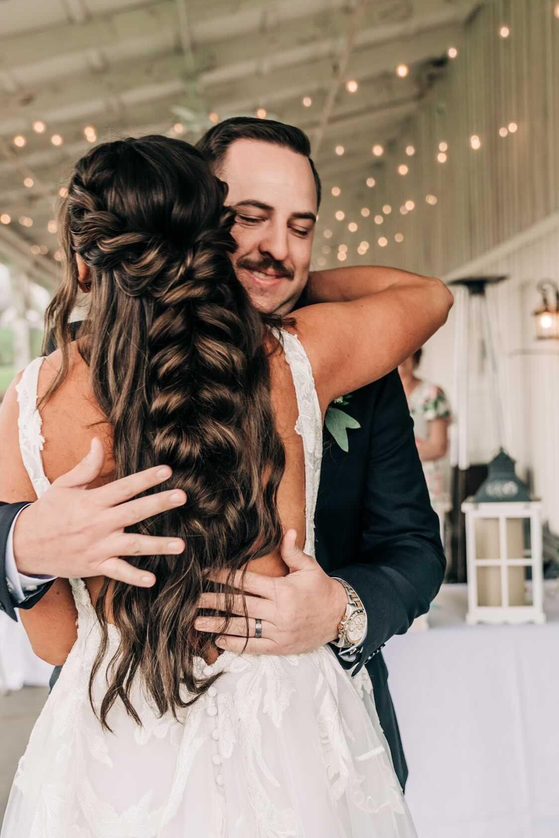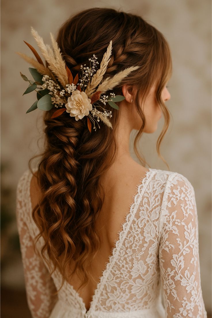 This hairstyle hits the perfect note between cozy and chic. A side-swept braid transitions into soft waves, with dried pampas, baby’s breath, and a neutral bloom tucked into the base. It’s ideal for brides embracing a rustic or earthy aesthetic, especially in barn, forest, or desert venues. The natural tones flatter every hair color but look particularly rich on chestnut and caramel hues.