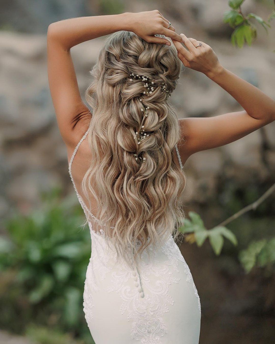 This one’s a showstopper. Two thick French braids sweep into a voluminous cascade of waves, anchored with golden wisps of baby’s breath and dried grass. It’s unapologetically romantic and ideal for bridesmaids with long hair who want something intricate yet wearable. Bonus: it stays put, even through post-ceremony dancing.