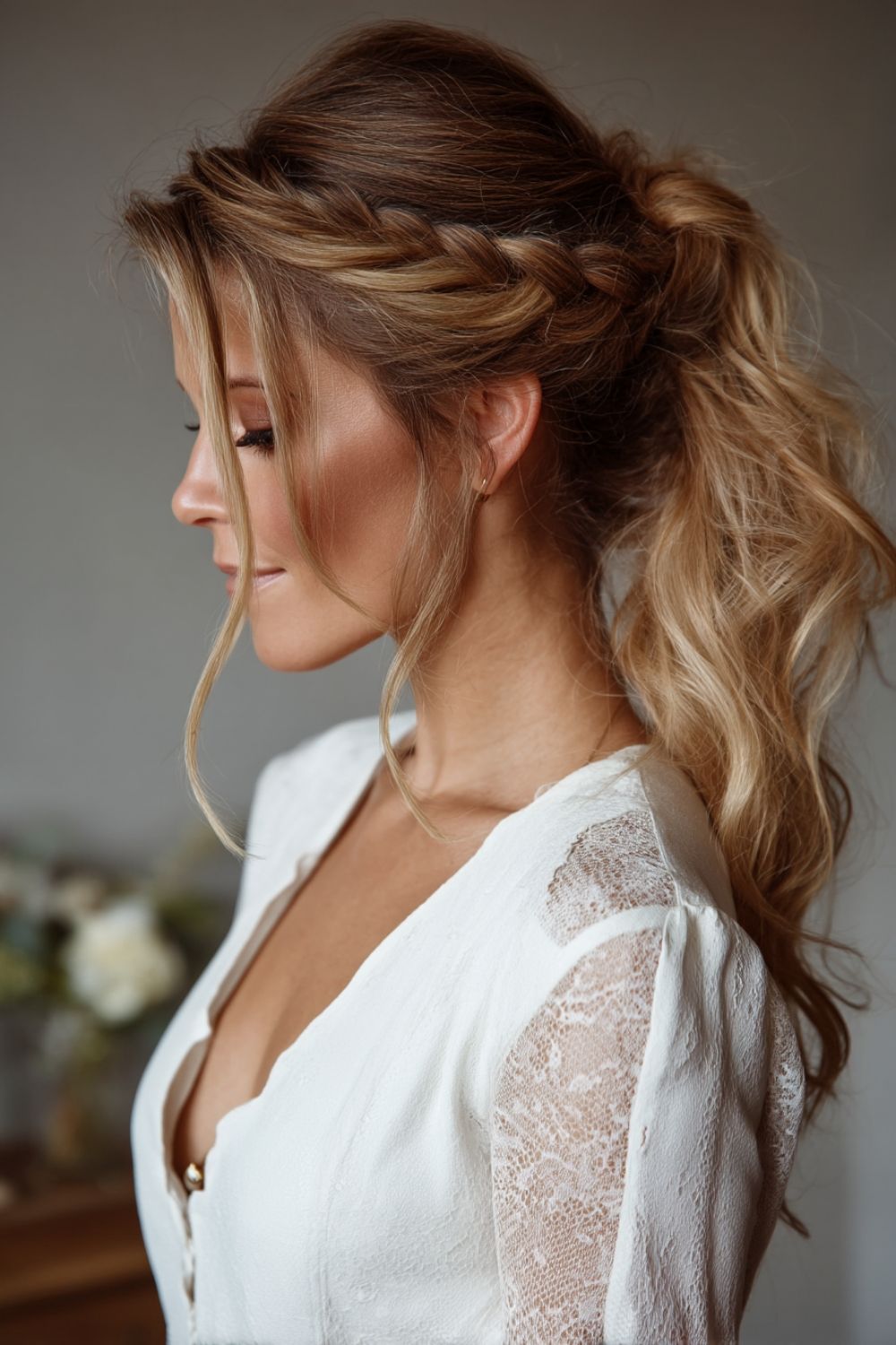 This is the “I woke up like this” of wedding hair — relaxed, full of texture, and anchored with a casual braid. It’s great for bridesmaids, especially those with medium length or bridesmaid half styles. The volume at the crown adds height and flatters rounder faces, while the braid gives structure. Ideal for second-day hair or breezy fall weddings.