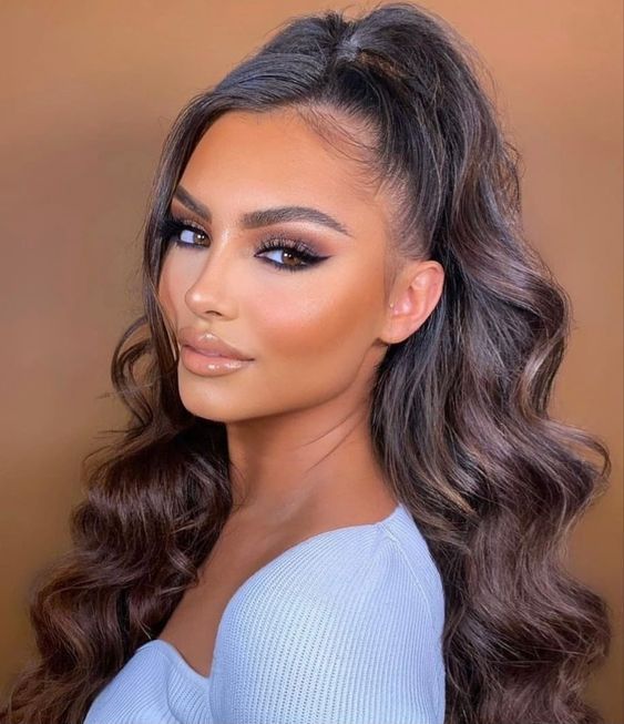 If you’re looking for a party hairstyle that oozes glam while keeping things cute and sophisticated, this half-up curly look is a perfect choice for New Year’s Eve. This style works wonders with long, voluminous hair, as the high ponytail adds height, and the cascading curls bring softness. The makeup complements the hairstyle, with bold eyes and nude lips, making it ideal for an Eve party. This look is particularly suitable for someone with oval or heart-shaped faces, as the ponytail and volume frame the face beautifully.