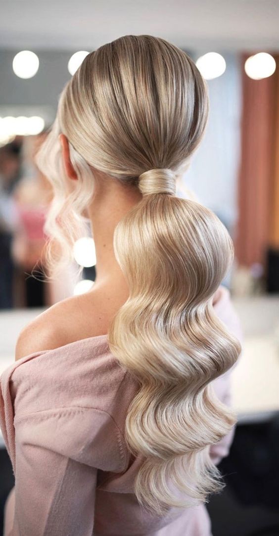 To enhance this look, try adding some sparkling pins or a glittery scrunchie at the base of the ponytail for extra pizzazz. Steer clear of overly complex outfits that may compete with the soft, delicate waves.