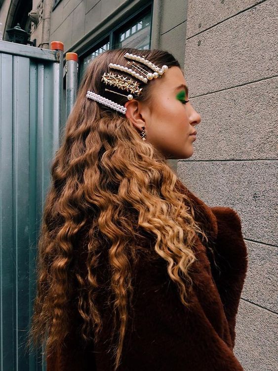 For those who want to add some drama to their New Year’s party, statement clips are the way to go. This wavy hairstyle with bold pearl and star clips is perfect for anyone who loves experimenting with accessories. The playful, layered texture of the hair paired with the strong accessories makes it a standout choice for Eve festivities.