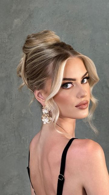 This sophisticated updo is all about balance. The high bun keeps the look polished while the loose tendrils that frame the face add a soft touch, making it perfect for formal party settings. The earrings, large and sparkling, act as a statement accessory, ensuring that this style grabs attention even from afar. This hairstyle is great for people with medium to long hair who want a party short hair look without the commitment of cutting their locks.