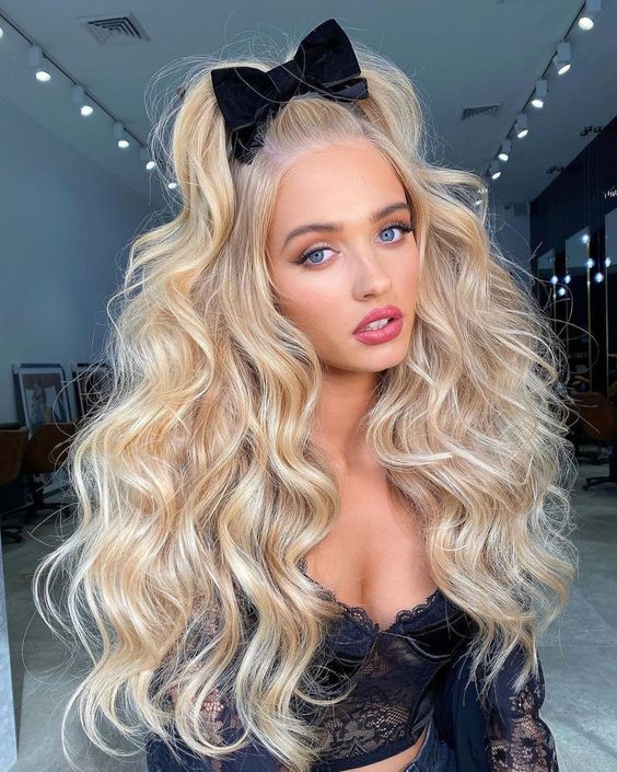 This elegant, soft wave hairstyle with a statement bow is pure vintage glamour and perfect for New Year’s Eve. The bow adds a cute yet chic vibe that can easily be worn to formal Eve parties or intimate gatherings. The half-updo frames the face beautifully, making it ideal for anyone with long, voluminous hair.