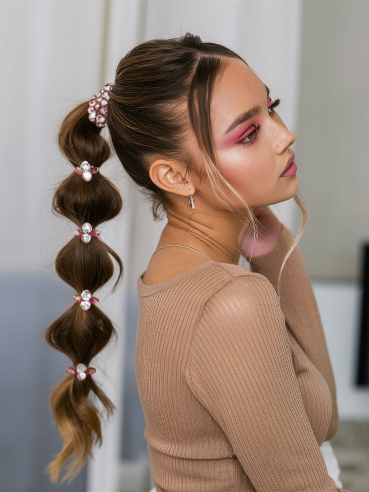 This hairstyle could benefit from adding some soft waves to the ponytail sections for extra texture. However, avoid adding too many accessories, as they may overwhelm the structured look of the bubbles.
