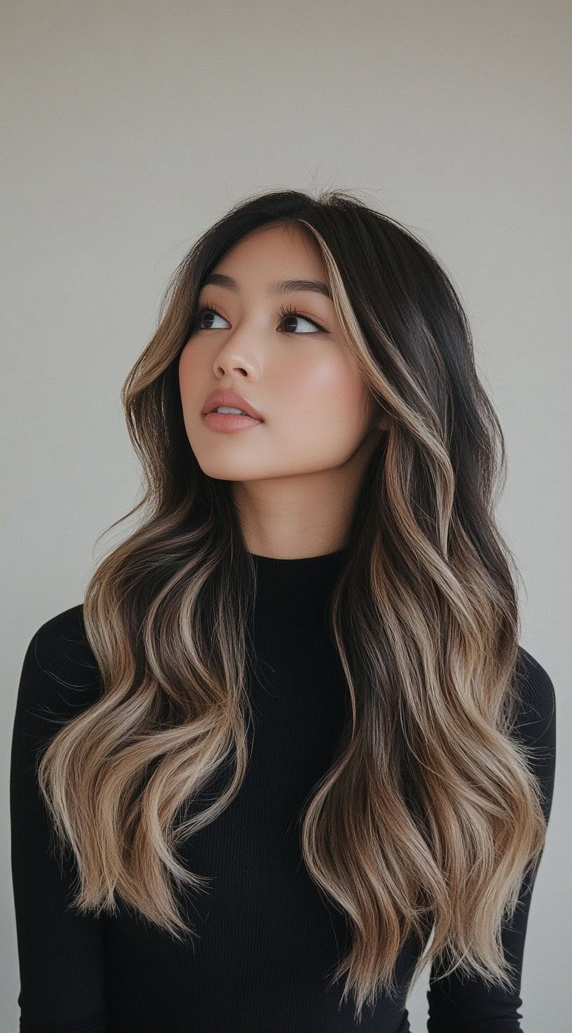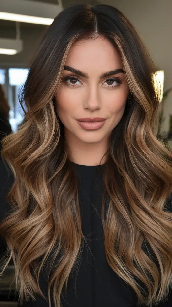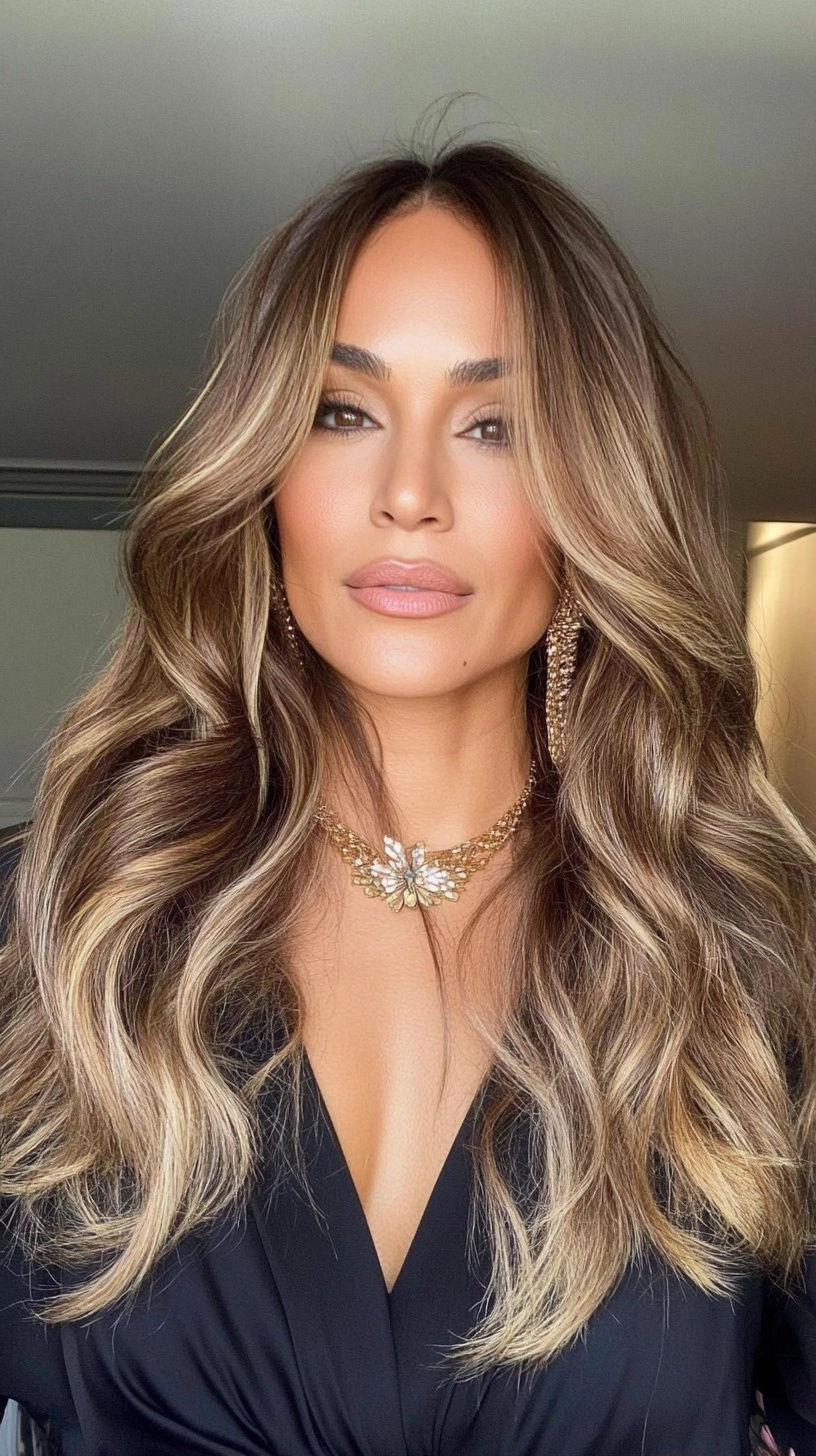 This look is all about a dark espresso base melting into caramel-toned balayage highlights. It’s timeless, polished, and incredibly flattering on women who prefer depth in their color. The long, defined waves accentuate the glossy blend, perfect for February elegance or even those late summer evenings. Suitable for both fine and thick hair, it elongates the face and keeps the overall effect natural but striking.