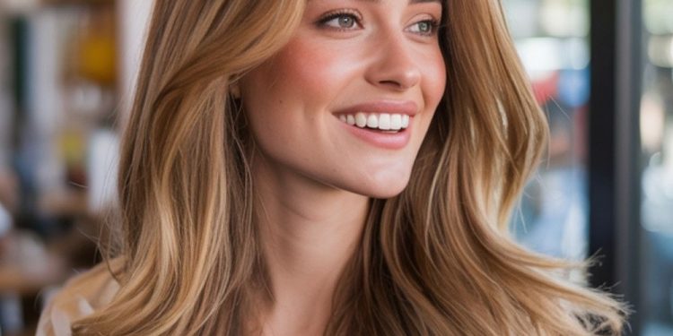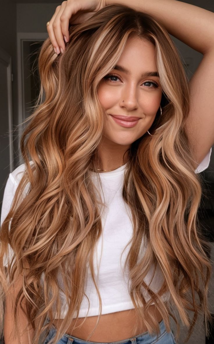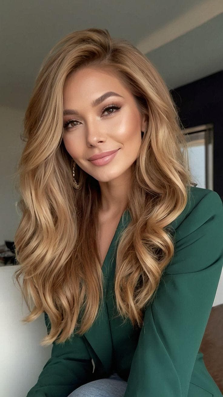 This hairstyle radiates warmth with long, layered waves in honeyed caramel tones that melt into lighter highlights. The look is flattering on oval and heart-shaped faces because the soft volume frames the features without overwhelming them. It’s a versatile choice for daily wear—professional enough for the office yet relaxed for weekends. Think of it as a universal option that works from January through August, carrying seamlessly into cooler months with its balanced, seasonless vibe.