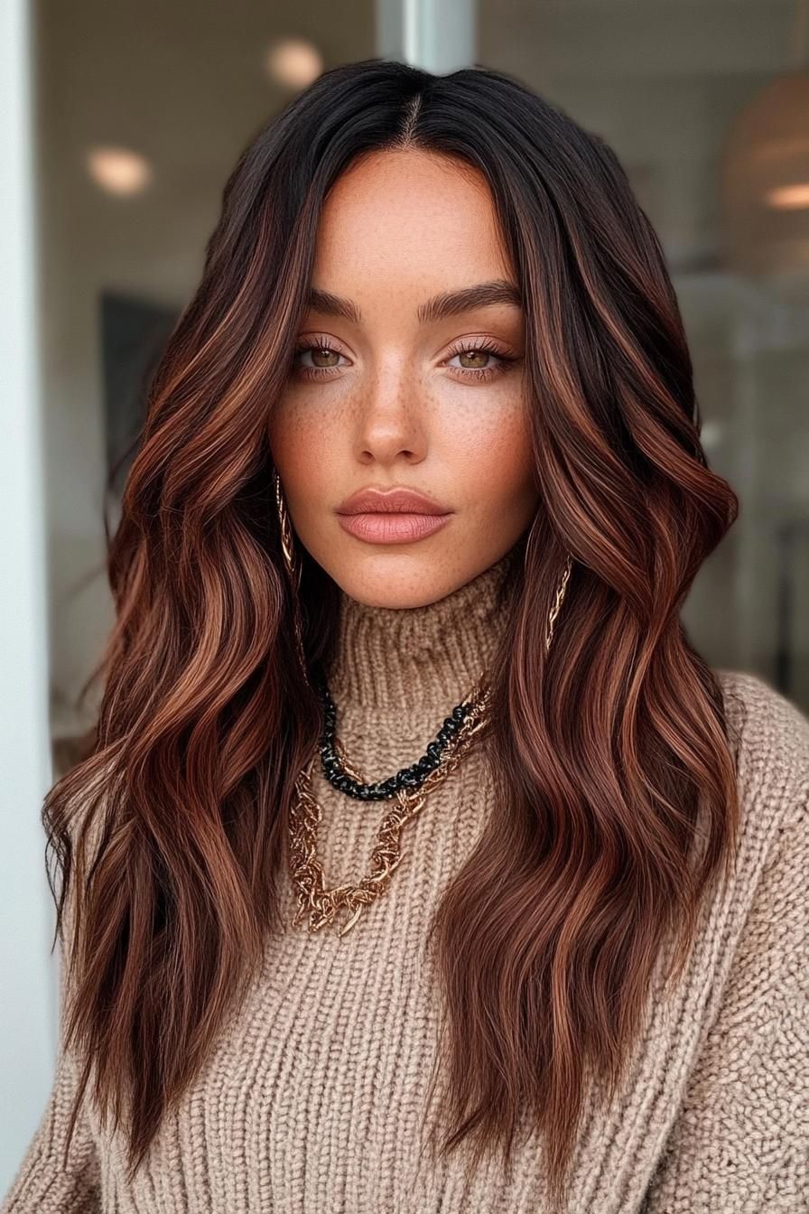 Warmth and richness define this style—a luxurious mix of deep chestnut brown threaded with auburn ribbons. The pairing feels both bold and sophisticated, making it a perfect shade for autumn or January when you crave warmth in your look. It flatters medium to long lengths and can also transition well into layered bobs for those seeking something shorter. Worn with textured waves and cozy knitwear, it channels a chic yet approachable energy.