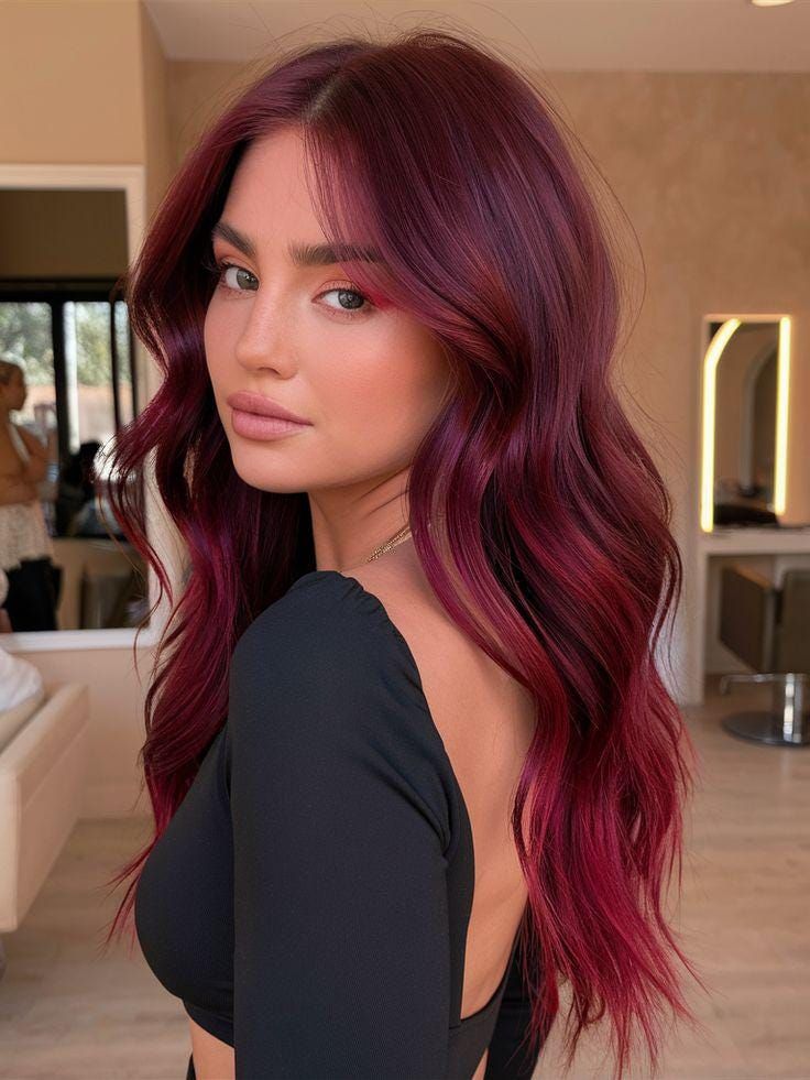 Here’s where boldness takes center stage: long layers in rich cherry wine, a mix of burgundy and magenta that thrives under sunlight. This shade is perfect for evenings out, romantic dinners, or a fun seasonal shift when you want to feel instantly elevated. Best suited for medium to long hair, the depth of the color enhances both light and dark complexions, making it a trendy statement for late winter through spring brown transitions.
