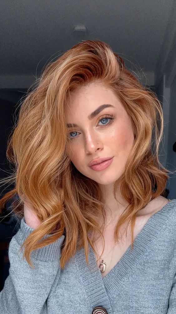 Hair: Light copper with a peach undertone, styled with loose waves for bounce.